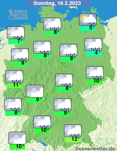 Am Sonntag ist es stark bis dicht bewölkt und es bilden sich doch vielerorts Schauer. Zumindest im Norden können sich im Tagesverlauf hier und da auch ein paar Auflockerungen zeigen, hier bleibt es dann weitgehend trocken. Die Temperatur steigt auf 4 Grad an der Oder und bis 12 Grad im Berchtesgadener Land.