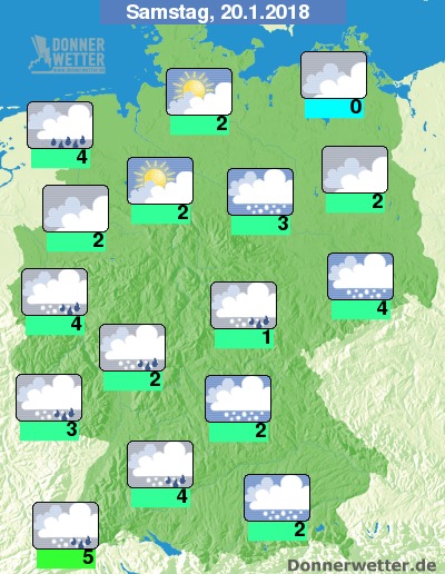 Am Samstag bleibt es weitgehend bedeckt, die besten Chancen auf etwas Sonne bestehen im Norden Deutschlands, hier bleibt es auch meist trocken, sonst fällt dagegen zeitweise Regen, Schneeregen oder Schnee. Besonders im Süden und Osten besteht Glättegefahr! Die Temperatur steigt auf nasskalte 0 bis 5 Grad.