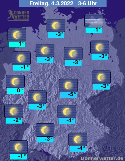 In der folgenden Nacht bleibt der Himmel verbreitet sternenklar, nur stellenweise kann sich Dunst oder Nebel bilden. Es bleibt überall trocken bei 1 Grad in Wilhelmshaven und -5 Grad in Jena.
