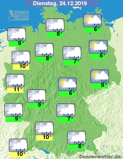 Die Höchsttemperaturen liegen bei unweihnachtlichen milden 6 bis 11 Grad, am kühlsten bleibt es im Nordosten, am wärmsten wird es im Rheinland.