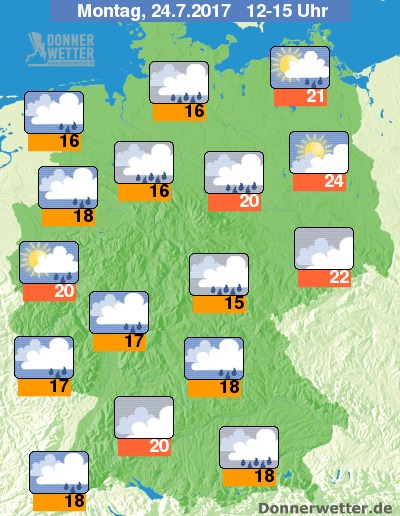 Heute Nachmittag halten sich größtenteils dichte Wolken, die für zeitweilige Regenfälle sorgen. Gewitter sind nur selten zu erwarten. Hier und da kann sich auch mal die Sonne blicken lassen. Die Temperatur liegt bei kühlen 15 Grad im Thüringer Becken und etwa 24 Grad in Berlin.