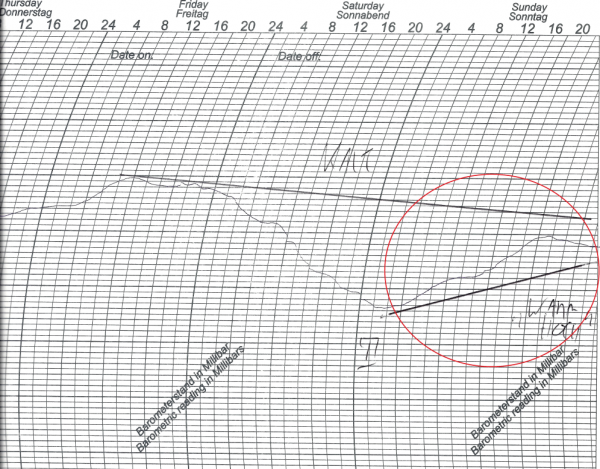 Zu sehen ist ein Schrieb, der den Luftdruckverlauf zwischen Donnerstag und Sonntag vergangener Woche an unserer Wetterstation in Bonn abbildet. Gut zu erkennen der nun steigende Luftdruck.