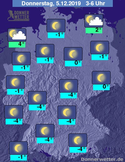 Die Temperaturen liegen mit Tiefstwerten um 0 bis -4 Grad nahezu bundesweit im Frostbereich, nur im locker bewölkten Küstenumfeld ist es mit +4 bis +2 Grad etwas milder.