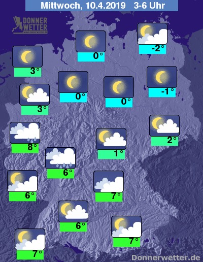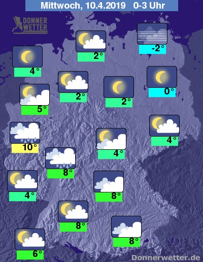 In den Nachtstunden ist der Himmel über dem Norden des Landes meist sternenklar, regional können hier auch mal lockere Wolken durchziehen; im Ostseeküstenumfeld kann sich Nebel bilden. In den südlicheren Landesteilen überwiegt in den nächsten Stunden wechselnde Bewölkung oder es ist bedeckt. Zwischen Eifel und dem Odenwald kann zeitweise Regen fallen, sonst bleibt es meist trocken.