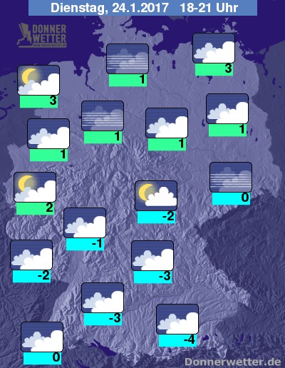 Heute Abend ist der Himmel meist wolkenverhangen, gebietsweise hält sich Nebel oder Hochnebel. Hier und da lockert die Bewölkung etwas auf. Es bleibt bundesweit trocken bei Werten zwischen -4 Grad in München und um 3 Grad in Emden.