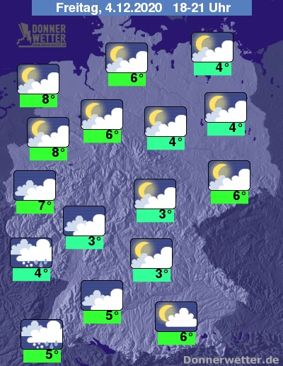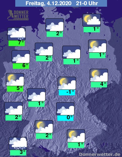 Im Laufe des Abends klingen die Niederschläge im Südwesten zunächst mal ab. Sonst gibt es teilweise Lücken in der Wolkendecke. Nacht Osten hin leuchten gelegentlich auch Mond und Sterne.