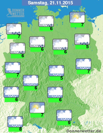 Am Samstag ziehen dabei verbreitet dichte Wolken durch und es lockert nur gebietsweise und vorübergehend auf. Dazu können vor allem gegen Abend, in der dann kälteren Luft teils Schneeflocken bis ins Flachland fallen. Insbesondere in höheren Lagen bleibt der Schnee häufig liegen, so dass hier mit Schneeglätte gerechnet werden kann. Die Temperatur steigt anfangs noch auf 5 Grad im Grabfeld und bis 9 Grad in München, bis zum Abend hin sinkt die Temperatur jedoch deutlich ab.