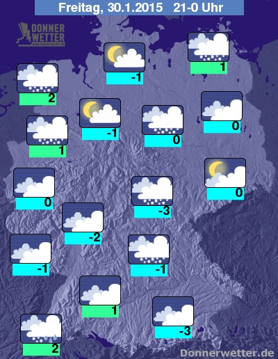 In der Nacht zum Samstag bleibt es überwiegend stark bewölkt und nur hier und da kann es auch mal auflockern, dabei fällt zunächst vor allem im Süden und Osten, gegen Ende der Nacht besonders in der Westhälfte des Landes Schnee. An der Nordsee ist teils auch Schneeregen oder Regen möglich. Es muss verbreitet mit Straßenglätte gerechnet werden. Die Tiefstwerte liegen bei 1 Grad an der Nordsee und -4 Grad im Coburger Land.