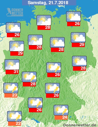 Am Samstag ist es über dem Norden überwiegend heiter, teil sonnig, teils aber auch aufgelockert bewölkt, jedoch trocken. Über der Südhälfte der Republik ziehen immer wieder auch dichte Quellwolken durch, die hier für zum Teil kräftige Schauer und Gewitter sorgen, dazwischen scheint aber auch vielerorts die Sonne. Die Temperatur erreicht 22 Grad am Oberrhein und bis 31 Grad in der Kölner Bucht.
