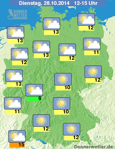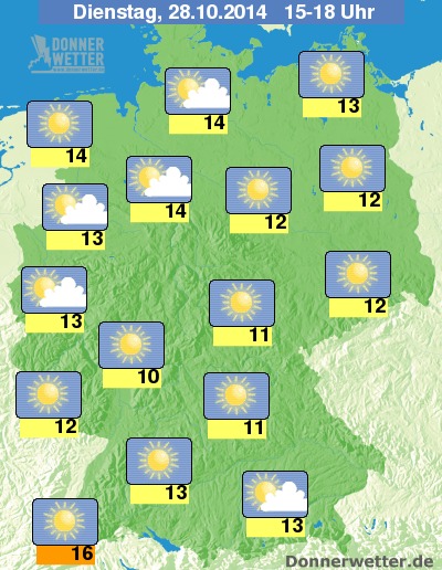 Im Nachmittagsverlauf heitert es dann weiter auf, leichte Bewölkung beschränkt sich dann in erster Linie auf den Nordwesten Deutschlands sowie den Alpenrand, um 11 bis 16 Grad.