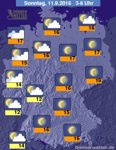In der Nacht zum Sonntag ist der Himmel westlich einer Linie vom Schwarzwald bis zur schleswig-holsteinischen Ostsee teils locker, teils aber auch stark bewölkt, dabei bleibt es jedoch meist trocken. Weiter nach Osten hin ist es dagegen verbreitet nur sternenklar und dabei auch trocken. Die Temperatur sinkt auf 17 Grad in Bremerhaven und bis auf 12 Grad am Westerwald.