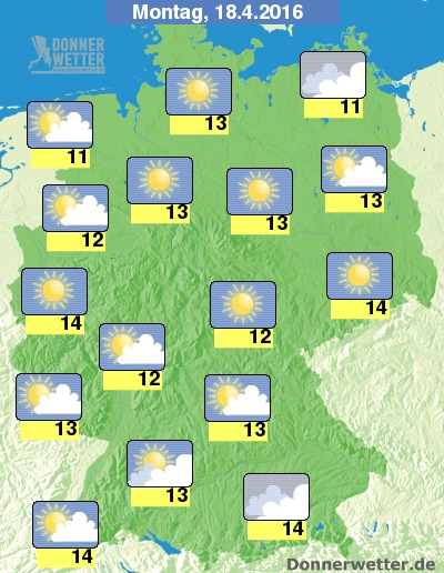 Am Montag halten sich im Südosten noch oft dichte Wolken, die auch etwas Regen bringen können, auch im Ostseeumfeld ist es häufig stark bewölkt, hier jedoch weitgehend trocken. Im großen Rest des Landes herrscht verbreitet heiteres bis sonniges und dabei trockenes Wetter. Die Temperaturen steigen auf 11 bis 14 Grad.