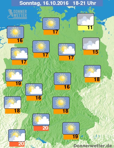 Heute Abend ist es von Brandenburg bis zur Ostsee meist stark bewölkt, jedoch trocken. Sonst scheint in weiten Teilen Deutschlands die Sonne bei oft nur wenigen Wolken. Von Südwesten ziehen jedoch zunehmend einige und teils auch dichtere Wolken auf, dazu bleibt es trocken. Die Temperatur liegt zwischen 11 und 20 Grad.