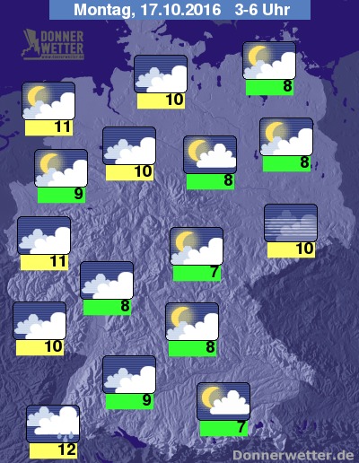 In der Nacht zum Montag nehmen die Wolkenanteile aus Südwesten her zu, vor allem im Osten und Norden zeigt sich der Himmel oft locker oder aufgelockert bewölkt. Um den Schwarzwald herum bilden sich einzelne Schauer, sonst bleibt es jedoch weitgehend trocken. Die Temperatur sinkt auf 12 bis 7 Grad.