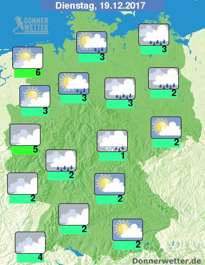 In der Nacht zum Dienstag zeigt sich von Bayern, über Thüringen, Sachsen bis Berlin-Brandenburg ein meist sternenklarer Nachthimmel. Oft stark bewölkt oder trüb ist es vom Südwesten bis in den Westen Deutschlands, dazu bleibt es trocken. In den übrigen Landesteilen ist es teils aufgelockert, gebietsweise aber auch stark bewölkt, jedoch überall trocken. Die Temperatur sinkt auf 4 Grad an der Nordsee und bis -3 Grad im Umland von München.