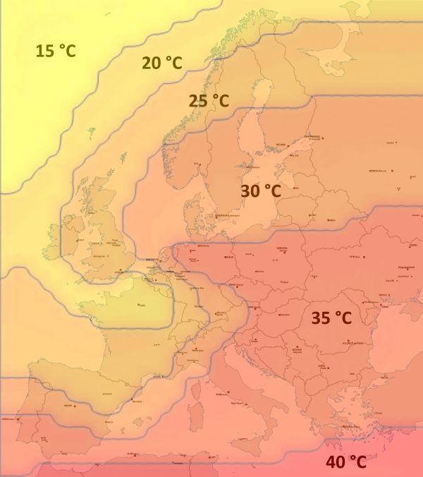Die folgende Karte zeigt die zu erwartenden Höchsttemperaturen in Europa am Donnerstag, 13 Uhr: