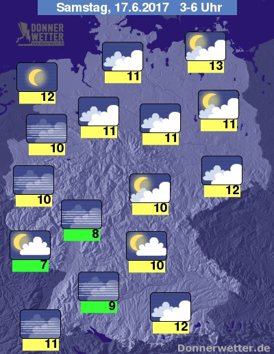 In der folgenden Nacht klingen letzte Schauer in den östlichsten Landesteilen rasch ab und die Bewölkung lockert auf. Vor allem über der Westhälfte der Republik ist der Himmel auch größtenteils sternenklar, dazu bleibt es trocken. Die Temperatur sinkt auf 12 Grad in Dresden und bis 7 Grad im Saargau.