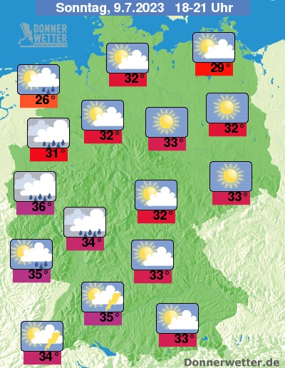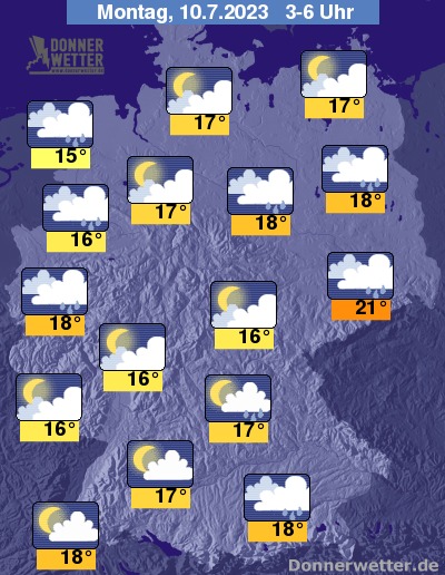 In der Nacht zum Montag erreichen die Schauer und möglichen Gewitter auch die östlichen Landesteile, sonst ist es oft stark, von Westen auch zunehmend längere Zeit aufgelockert bewölkt. Es bilden sich hier und da einzelne Schauer, oft bleibt es aber auch trocken. Die Temperatur sinkt auf tropische 21 Grad in Dresden und bis 15 Grad in Cuxhaven.