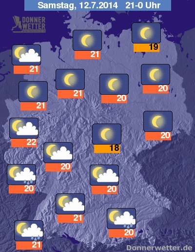 Am Abend können sich im Süden und Südwesten weitere Schauer und Gewitter entladen, sonst ist der Himmel dagegen verbreitet klar oder nur locker bewölkt und es bleibt trocken. DieAbendwerte liegen bei schwülwarmen 21 Grad im Breisgau und angenehmen 18 Grad im Thüringer Wald.