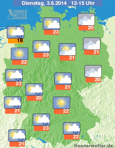 Am Nachmittag und zum Abend hin halten sich im Osten oft dichte Wolken, aber hier ist es meist trocken. Nach Süden und Westen ist mit teil kräftigen Schauern und Gewittern zu rechnen. Sonst ist es besonders von der Mitte bis in den Norden verbreitet heiter und trocken. Die Temperaturen liegen bei 18 bis 23 Grad.