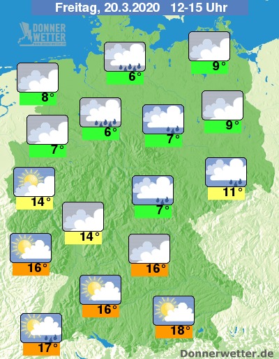 Am frühen Nachmittag dominieren in der Nordhälfte die Wolken und gebietsweise fällt Regen. Im Süden und Westen gibt es noch größere sonnige Phasen, bevor sich regional mächtigere Haufenwolken mit örtlichen Schauern und einzelnen Gewittern entwickeln.