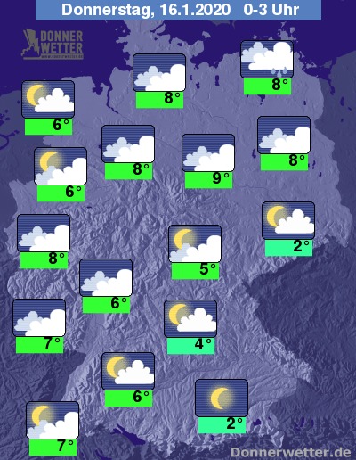In der Nacht zeigt sich der Himmel über dem Norden und Westen des Landes anfangs überwiegend stark bewölkt oder bedeckt, an der Ostseeküste können zudem noch einzelne Schauer fallen. Im Südosten dominiert lockere oder aufgelockerte Bewölkung.