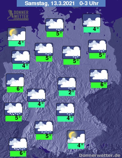In der Nacht auf Samstag bleibt der Himmel überwiegend bedeckt, temporäre Auflockerungen beschränken sich vor allem auf das Umfeld der Küsten sowie den Alpenrand. Verbreitet muss in den Stunden nach Mitternacht mit Schauern gerechnet werden, in den frühen Morgenstunden trocknet es im Nordwesten dann kurzzeitig auch mal ab. Ab 600 bis 800 Meter können im Bergland auch Schneeregen- oder Schneeschauer fallen.