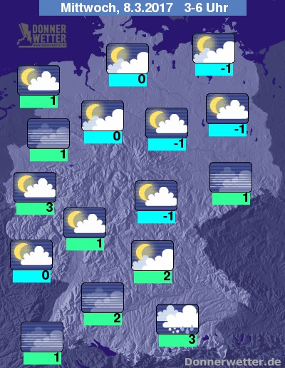 In der folgenden Nacht lockert die Bewölkung verbreitet immer weiter auf. Meist bedeckt bleibt es jedoch über dem südlichen Bayern, hier fällt zeitweise Regen, zum Teil auch Schneeregen oder Schnee mit möglicher Glättegefahr! Im übrigen Bundesgebiet bleibt es hingegen weitgehend trocken. Die Temperatur sinkt auf 3 Grad in Aachen und bis etwa -1 Grad in Neubrandenburg.