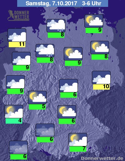 In der Nacht zum Samstag sind im Alpenvorland zunächst weitere Schauer möglich. Im übrigen Land ist es hingegen verbreitet nur locker bis aufgelockert, hier und da auch stark bewölkt und zunächst überall trocken. Zum Morgen hin ziehen im Norden allerdings dichte Wolken mit zeitweiligem Regen auf. Die Temperatur sinkt auf 11 Grad an der Nordsee und bis 4 Grad im Saargau.