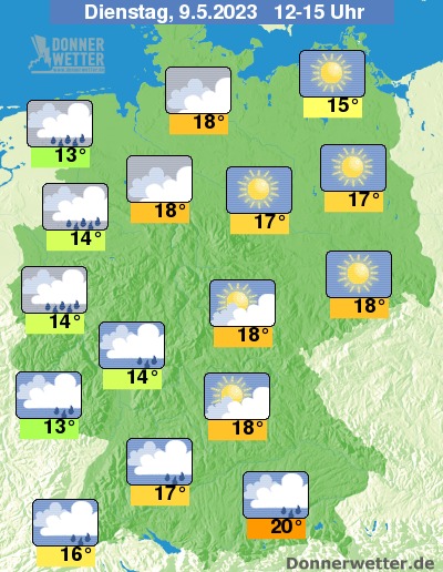 Heute Nachmittag ist es über der Westhälfte meist bedeckt und es bilden sich gebietsweise Schauer, wobei im weiteren Verlauf eher zeitweise Regen fällt. Dagegen ist es über der Osthälfte weitgehend heiter bis sonnig und trocken. Die Temperatur liegt bei 13 Grad in Cuxhaven und etwa 20 Grad in München.