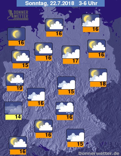 In der folgenden Nacht ist der Himmel über dem Norden und Osten teils stark, teils auch nur locker bewölkt oder klar, dazu bleibt es trocken. Im Süden, Westen und der Mitte des Landes ziehen jedoch oft dichte Wolken durch, die vor allem in der ersten Nachthälfte gebietsweise Schauer und mögliche Gewitter bringen. Gegen Morgen sind kaum noch Schauer möglich. Die Temperatur sinkt auf 19 Grad in Bonn und bis 14 Grad am Pfälzer Wald.