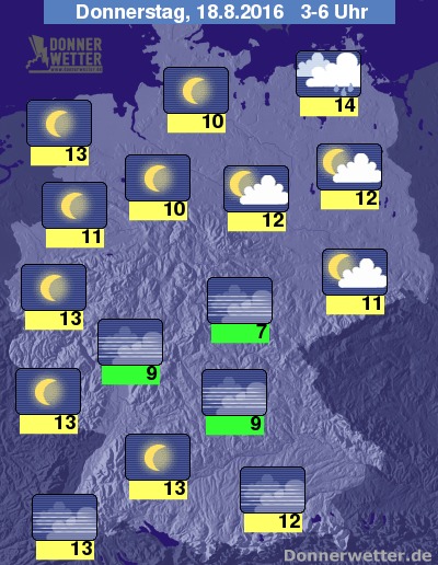 In der Nacht zum Donnerstag ziehen im äußeren Nordosten oft dichte Wolken durch, die hier auch gebietsweise Regen bringen. Lockere Wolken halten sich auch über dem Osten des Landes. Im übrigen Bundesgebiet ist es dagegen verbreitet sternenklar und dazu auch trocken. Die Temperatur sinkt auf 14 Grad in Rostock und 7 Grad am Thüringer Wald.