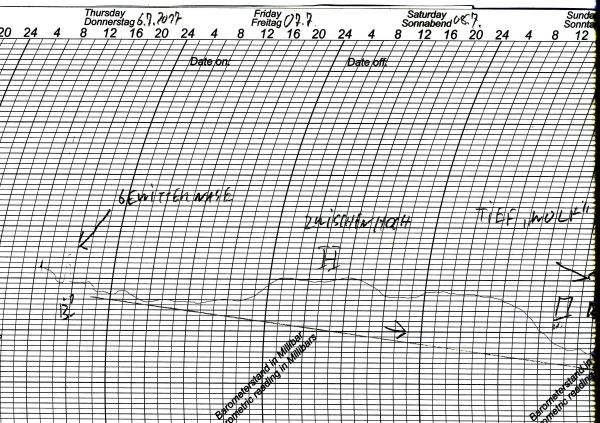 Unser Schrieb zeigt den Luftdruckverlauf zwischen Donnerstag und Sonntag vergangener Woche an unserer Wetterstation in Bonn. Darauf zu erkennen: Eine ungewöhnlich ausgeprägte "Gewitternase" am Donnerstagvormittag, der Einfluss eines Zwischenhochs in der ersten Tageshälfte des Samstag sowie der Übergang zu tiefem Luftdruck ab Sonntag: