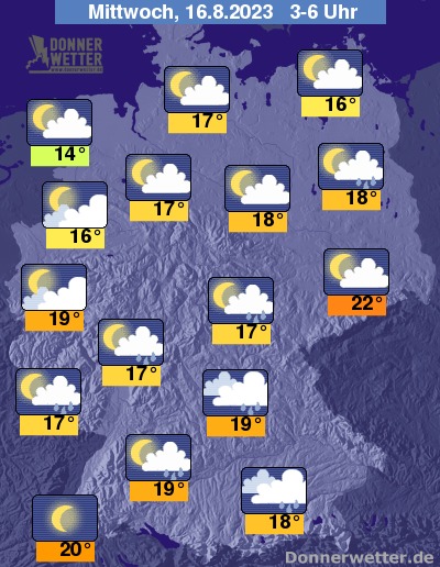 In der Nacht zum Mittwoch bilden sich über der Südosthälfte Deutschlands gebietsweise Schauer und örtliche Gewitter. Weiter nach Nordwesten hin ist es teils locker, teils stark bewölkt, aber weitgehend trocken. Die Temperatur sinkt auf tropisch warme 22 Grad in Dresden und bis 14 Grad in Bremerhaven.