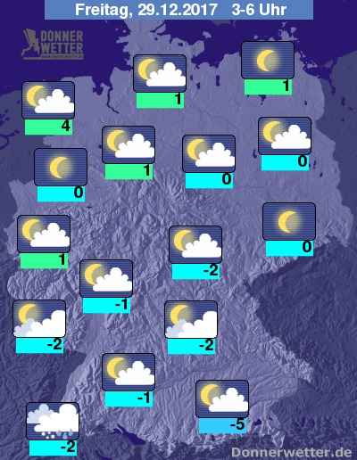 Die Tiefstwerte bewegen sich dazu in vielen Regionen rund um den Gefrierpunkt. Deutlich kühler wird es nur in den Tälern im Süden, während es an der Nordsee mit bis zu 4 Grad vergleichsweise mild bleibt.