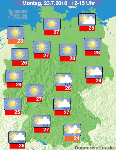 Heute Nachmittag ziehen über den Süden Deutschlands sowie vom Thüringer Wald bis zum Erzgebirge gebietsweise dichte Quellwolken mit möglichen Schauern und Gewittern durch. Im übrigen Land strahlt dagegen verbreitet die Sonne und es bleibt trocken. Die Temperatur liegt bei 23 Grad an der Nordsee und etwa 29 Grad im Rheinland.