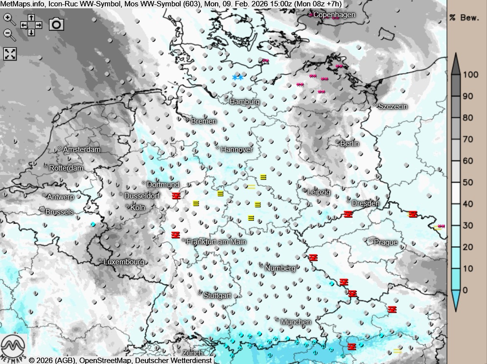 Die Temperatur- und Wetterkarte nach ICON-RUC für 15:00 Uhr: