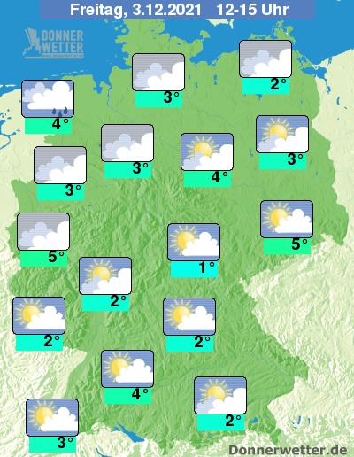 Die Temperaturen erreichen am Nachmittag Höchstwerte um 1 Grad in Erfurt, 3 Grad in Berlin und um 6 Grad in Ostfriesland.