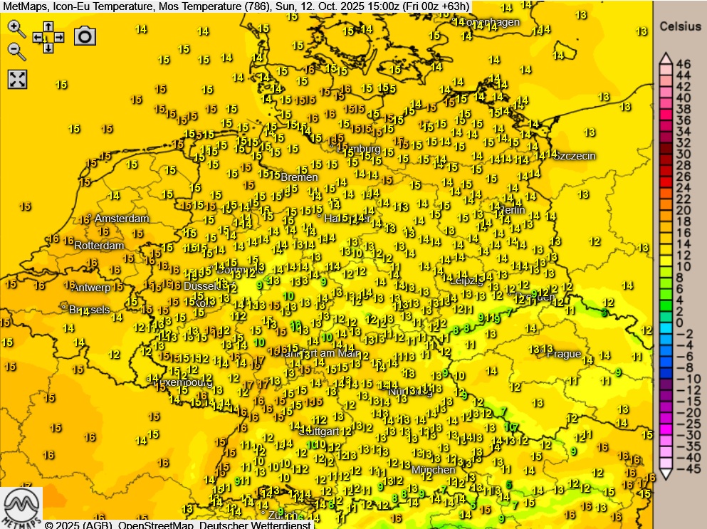 Die Temperatur- und Wetterkarte nach Icon-Eu für Sonntagnachmittag (15:00 Uhr):