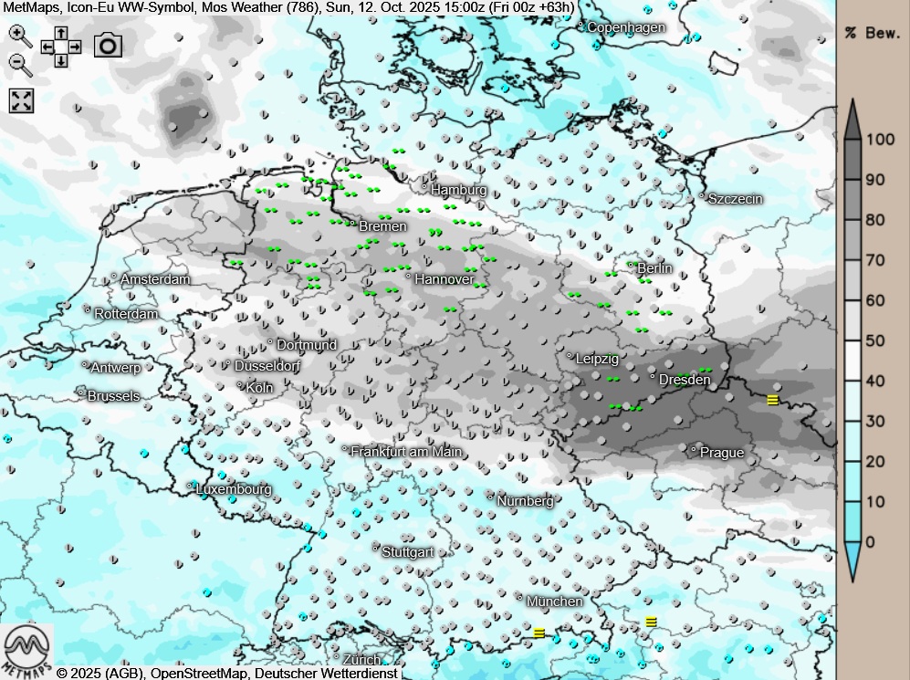 Am Sonntagnachmittag zeigt sich der Himmel über dem Süden und Südwesten wechselnd bis aufgelockert bewölkt. In den übrigen Regionen bleibt der Himmel auch am Nachmittag stark bewölkt oder es ist bedeckt, im Norden und Osten kann zeitweise auch etwas Regen fallen.