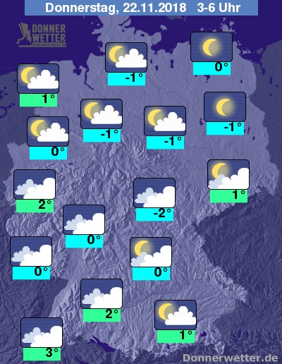 Die Temperaturen sinken auf Werte um 3 Grad C am Oberrhein und um -2 Grad C im Thüringer Wald.