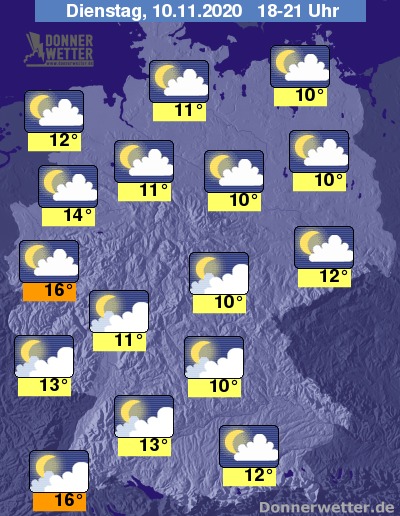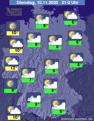 Vor Dämmerungsbeginn halten sich die Temperaturen meist noch im milden zweistelligen Bereich zwischen 10 und 16 Grad. Am wärmsten bleibt es dabei in der Kölner Bucht und in Freiburg.