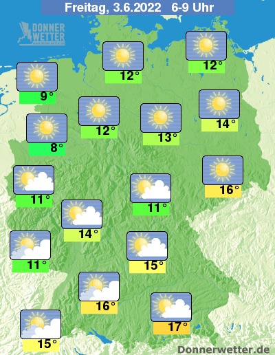 Die Temperaturen fallen auf Werte um 15 Grad im Breisgau und 6 Grad im Thüringer Becken.