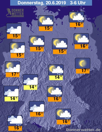 In der Nacht zeigt sich der Himmel zunächst überwiegend locker oder aufgelockert bewölkt, im Verlauf nimmt die Bewölkung vor allem in der Westhälfte gebietsweise zu. Verbreitet muss anfangs mit Schauern gerechnet, in der zweiten Nachthälfte konzentrieren sich die Niederschläge dann meist nur noch auf die Südhälfte des Landes.