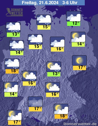 In der Nacht zum Freitag überwiegt über weiten Landesteilen wechselnde Bewölkung, in der Osthälfte ist es auch gering bewölkt oder sternenklar. Niederschläge sind in der Nacht gebietsweise vor allem in der West- und Südwesthälfte möglich, in den übrigen Landesteilen bleibt es meist trocken.