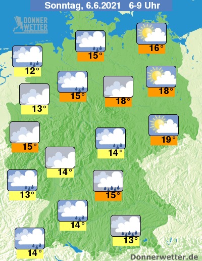 In der Nacht auf Sonntag bleibt es bei teils lockerer, teils aufgelockerter Bewölkung östlich der Elbe weitgehend trocken. In den übrigen Landesteilen ist die Wolkendecke zumeist geschlossen oder es ist stark bewölkt; vor allem im Nordwesten sowie südlich des Mains können im Nachtverlauf immer wieder teils kräftige Schauer fallen, auch lokale Gewitter sind nach wie vor möglich. Lokal besteht weiterhin Unwettergefahr.