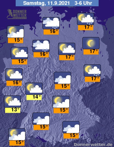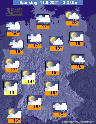 In der Nacht auf Samstag zeigt sich der Himmel zunächst noch verbreitet wechselnd oder stark bewölkt, in den frühen Morgenstunden lockern die Wolken dann aber vor allem im Westen zunehmend auf. Im Norden und Osten sowie am Alpenrand muss in der Nacht weiterhin mit Schauern und einzelnen Gewittern gerechnet werden, in den übrigen Landesteilen bleibt es überwiegend trocken.