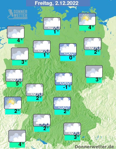 Am Freitag zeigt sich der Himmel über weiten Landesteilen stark bewölkt oder bedeckt, einzelne Auflockerungen beschränken sich auf das Ostseeküstenumfeld und den äußersten Südwesten. Vor allem im Osten und der Mitte muss zeitweise mit Schneeschauern gerechnet werden, ab dem Mittag dann auch häufiger im Südosten. Vorsicht Glättegefahr! Im Süden und Westen fallen die Niederschläge meist als Regen, in höheren Lagen auch als Schneeregen.Überwiegend trocken bleibt es am Freitag an den Küsten sowie im Südwesten.