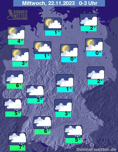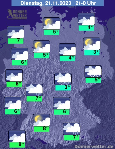 Am späten Abend und in der Nacht bleibt es über der Nordhälfte bei häufigeren Auflockerungen trocken, vereinzelt kann sich Nebel oder Hochnebel bilden. Im Süden ist es stark bewölkt oder bedeckt und immer wieder fällt Regen, oberhalb von 500 m (Mittelgebirge) auch Schnee.