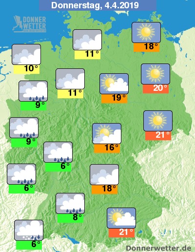 Die Höchsttemperaturen liegen unter den dichten Regenwolken im Westen meist nur zwischen 5 und 10 Grad, sonst zwischen 11 und 18 Grad und im Osten können mit sonniger Unterstützung Werte von 18 bis 21 Grad erreicht werden.
